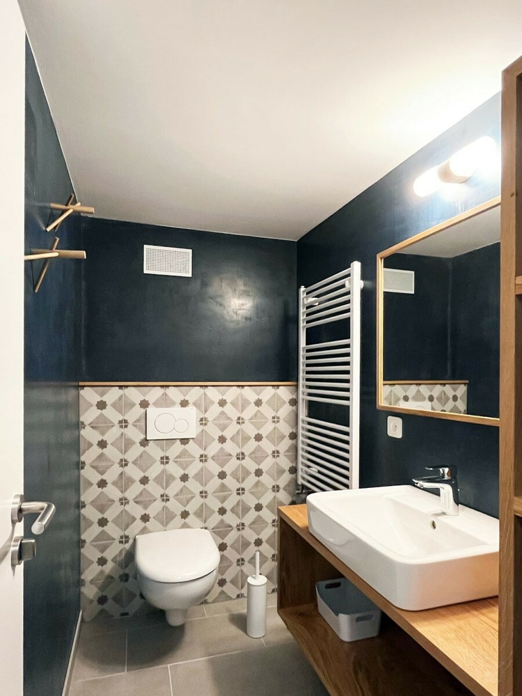 • Badezimmer: großzügige ebenerdige begehbare Dusche, Waschtisch, WC, Handtuchheizung, Haartrockner, kostenlose Pflegeprodukte, Toilettenpapier.