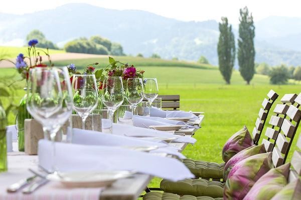 "Willkommen zum Genuß" im Restaurant in modern ländlichem Ambiente und zu den wärmeren Jahreszeiten auf der Veranda oder im Naturgarten.